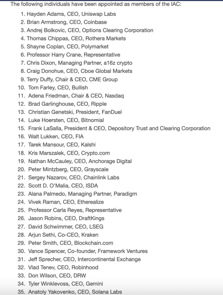 В состав комитета вошли такие известные фигуры, как CEO Coinbase Брайан Армстронг, глава Ripple Брэд Гарлингхаус, соучредитель Solana Анатолий Яковенко, а также руководители Uniswap, Kraken, Kalshi, Polymarket, Robinhood и a16z crypto.