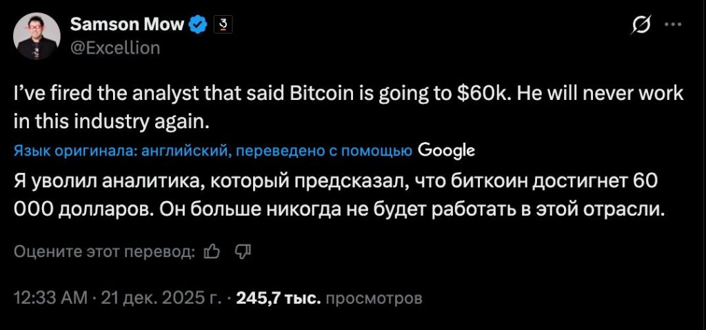 В декабре он устроил один из тех публичных перформансов, которые криптосообщество особенно любит в бычьи времена. Моу заявил, что якобы «уволил аналитика, который предсказал биткоин по $60 000». Причина — слишком медвежий прогноз, слишком «неправильная» вера, слишком неприятная цифра для рынка, который тогда жил в режиме вечного оптимизма.