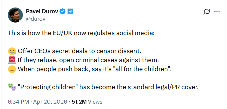 Дуров сформулював це досить жорстко, заявивши, що аргумент «захисту дітей» поступово перетворився на універсальне виправдання для розширення цифрового контролю. За його словами, ця риторика має високу емоційну силу і дозволяє знижувати рівень суспільного спротиву, оскільки апелює до базових інстинктів і питань безпеки: «Коли люди чинять опір, кажіть, що це “все заради дітей”. “Захист дітей” став стандартним юридичним і піар-прикриттям».