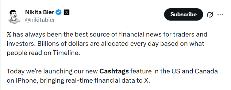 Окремо варто зазначити, що Cashtags — це не спроба перетворити X на брокера. Керівник продуктового напряму Нікіта Бір прямо підкреслив: компанія не планує обробляти угоди або виступати посередником. Це принципова позиція. X будує не торгову інфраструктуру, а інформаційний шар поверх неї.