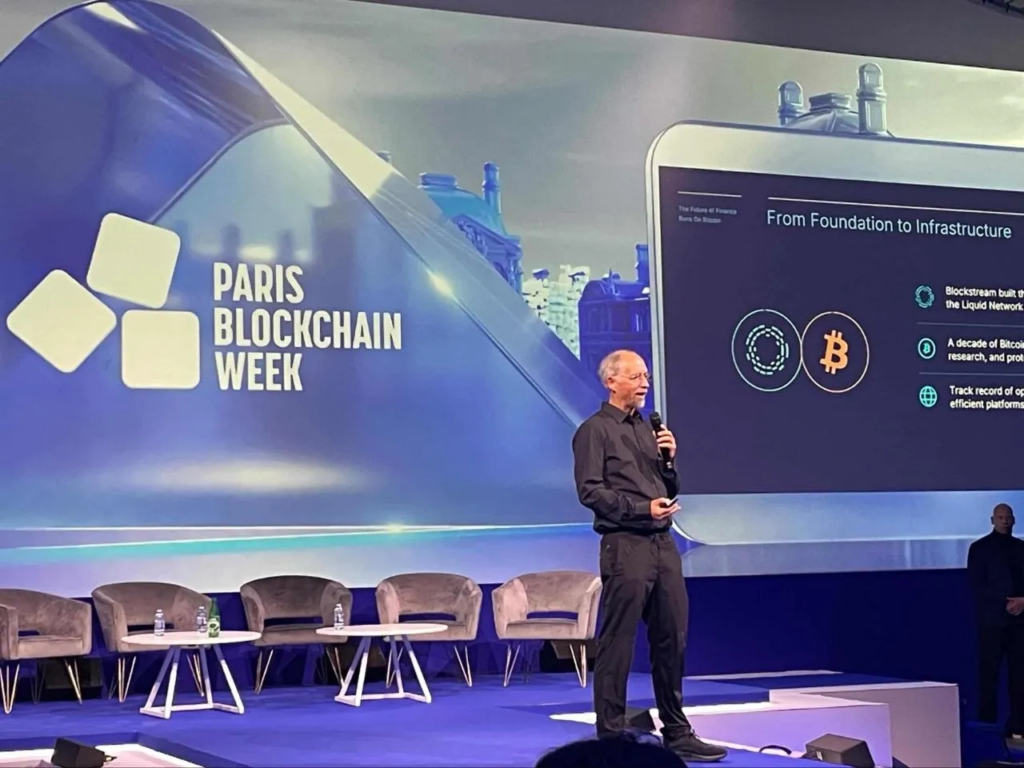 Адам Бек виступає на Blockchain Paris Week. Джерело: ForkLog