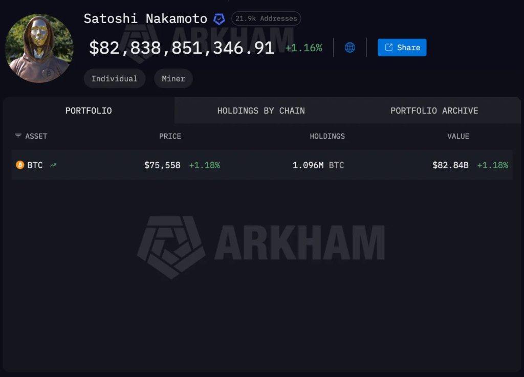 Цей тезис особливо важливий, оскільки він б’є по одній із найстійкіших легенд крипторинку — «мільярдному статку Сатоші». Традиційно вважається, що йому належить від 500 000 до 1 млн BTC. Деякі аналітичні платформи, такі як Arkham, оцінюють його запаси в 1,096 млн BTC, що за поточними цінами еквівалентно десяткам мільярдів доларів.