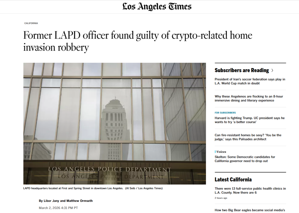 Журі Верховного суду округу Лос-Анджелес визнало колишнього офіцера поліції Еріка Галема винним у викраденні та пограбуванні 17-річного підлітка, у якого було викрадено близько 350 000 доларів у біткоїнах. Про це повідомляє Los Angeles Times.Йдеться про гучну справу 2024 року, яка викликала широкий суспільний резонанс не лише через суму, а й через статус обвинуваченого.