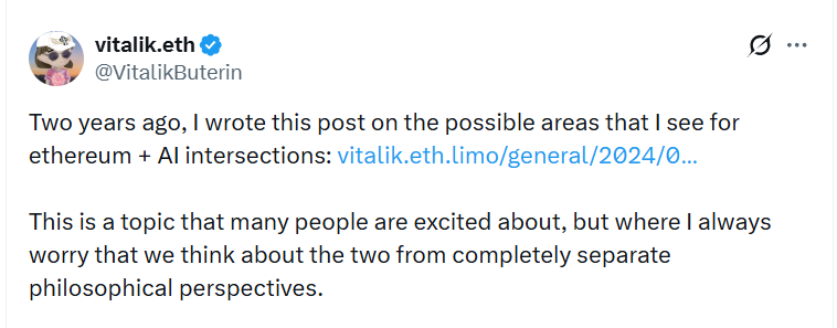 Перевод: «Два года назад я написал этот пост о возможных направлениях, в которых, как мне кажется, могут пересекаться Ethereum и ИИ: https://vitalik.eth.limo/general/2024/01/30/cryptoai.html . Это тема, которая многих вдохновляет и вызывает большой интерес, но меня всегда беспокоит, что мы часто рассматриваем эти две области с совершенно раздельных философских точек зрения».