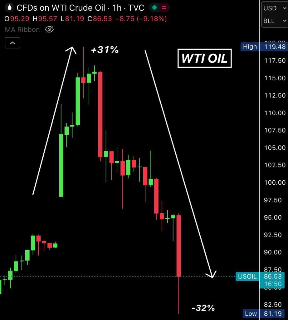 Однако 9 марта ситуация развернулась почти столь же стремительно, как и возникла. Нефтяные котировки рухнули примерно на 32% всего за 19 часов, опустившись к отметке около 81 доллара за баррель. Подобные колебания для нефтяного рынка крайне редки. Обычно такие движения формируются неделями или месяцами, а не в течение одного торгового дня.