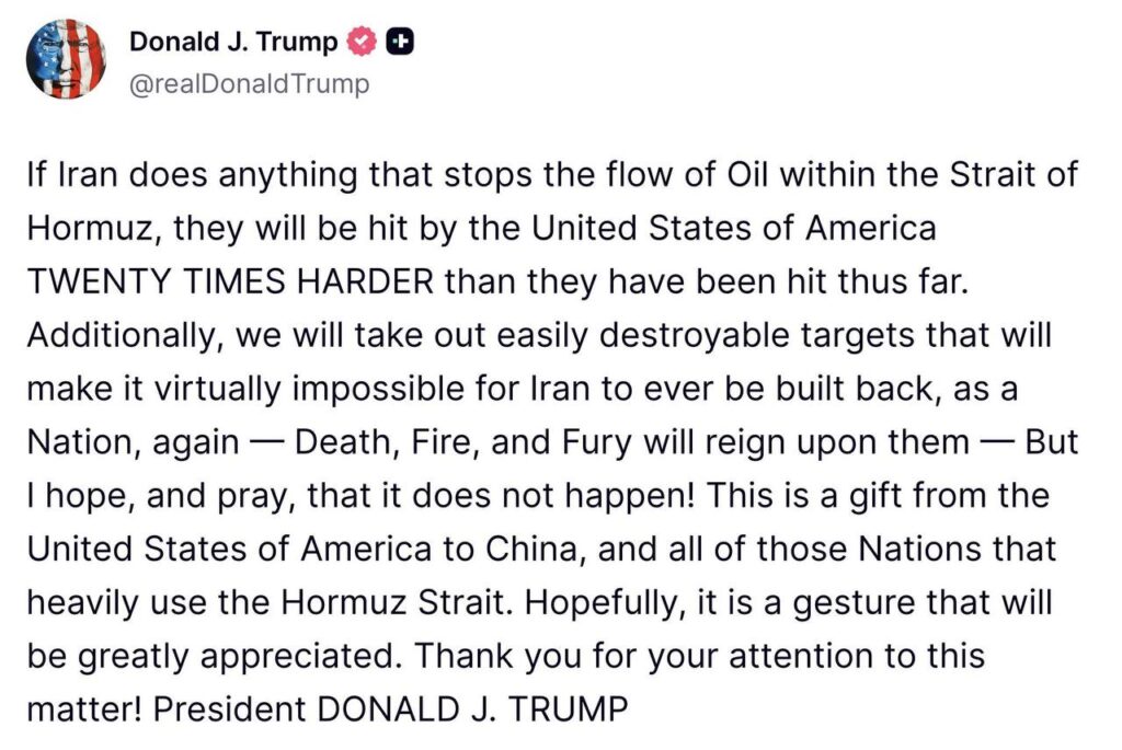 Спокойствие продлилось недолго. Уже на следующий день Трамп вновь ужесточил риторику. В социальной сети Truth Social он заявил, что если Иран предпримет попытку блокировать Ормузский пролив, США нанесут удар «в двадцать раз сильнее». Президент также добавил, что американская сторона способна уничтожить объекты, после которых Иран «фактически не сможет восстановиться как государство».
