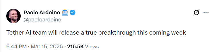 Компания Tether объявила о подготовке к презентации нового продукта на базе искусственного интеллекта, который руководство называет «революционным». По словам генерального директора Paolo Ardoino, уже на следующей неделе компания представит решение, способное существенно повлиять на развитие как криптовалютной индустрии, так и экосистемы децентрализованных технологий.