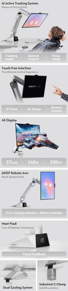 Концепция CyboPal One строится вокруг идеи «живого» экрана. Монитор установлен на роботизированной подвижной платформе и способен автоматически менять положение в пространстве, подстраиваясь под позу пользователя. Система отслеживает положение тела, угол наклона головы и дистанцию до экрана, корректируя высоту, угол и направление дисплея без ручных настроек. Разработчики делают акцент на том, что не существует «идеальной» статичной позы: человеку физиологически необходимо менять положение каждые 30–40 минут. Обычный фиксированный монитор, по их мнению, разрушает состояние потока — стоит откинуться в кресле или изменить позу, как фокус внимания теряется.