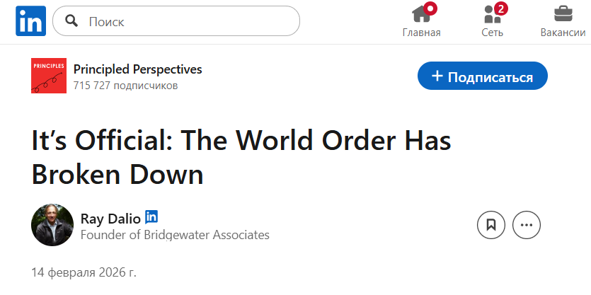 Американский миллиардер и основатель крупнейшего в мире хедж-фонда Bridgewater Associates Рэй Далио заявил, что послевоенный мировой порядок официально сломался. Управляющий активами примерно на 130 млрд долларов считает, что человечество вступило в период, который он называет «великим беспорядком», когда привычные правила международных отношений перестают работать, а система все больше движется по логике силы, а не договоренностей.